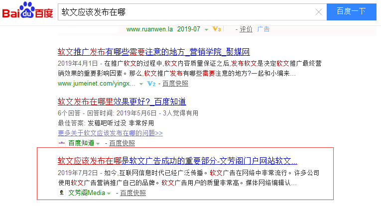 文芳閣傳媒認(rèn)為當(dāng)精準(zhǔn)詞優(yōu)化難度較時(shí),不妨轉(zhuǎn)換角度。用長(zhǎng)尾詞做軟文發(fā)布,以軟文行業(yè)為例,如下圖的“軟文應(yīng)該發(fā)布在哪”這種長(zhǎng)尾關(guān)鍵詞,每天的搜索量在1000-2000之間,這種詞不但搜索量大,而且這么長(zhǎng)的詞做排名也相對(duì)容易好多,所以在這里給大家一個(gè)建議:先找對(duì)關(guān)鍵詞,如果自己公司的官網(wǎng)權(quán)重高則可以編寫文章直接在官網(wǎng)發(fā)布,如果權(quán)重不夠高,則可以挑選一些權(quán)重高的媒體發(fā)布,發(fā)布后搜索關(guān)鍵詞則有很大的幾率展現(xiàn)在百度首頁,提高產(chǎn)品的曝光率,有條件的話可以鋪量,一條曝光率不夠,那么100條呢,這是一個(gè)長(zhǎng)期有收益的推廣方式。